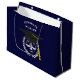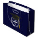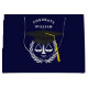 Bolsa de regalo para graduación de una escuela de derecho creativa que presenta escalas únicas de justicia en negro y con tapa de grado dorado sobre fondo azul marino. Para personalizar el texto de edición para añadir el nombre de la nota de abogado.