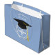 Bolsa de regalo para graduación de una escuela de derecho creativa con escalas únicas de justicia en negro y con tapón de oro en fondo azul claro. Para personalizar el texto de edición para añadir el nombre de la nota de abogado.