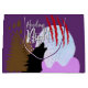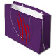 Una gran bolsa de regalo morada con un diseño impactante de Halloween. El bolso tiene una silueta de lobo en forma de aullido sobre un fondo de luna llena y un bosque. Las palabras "Noche de Amortiguamiento" se exhiben de forma destacada en las letras de plata de goteo, acompañadas de marcas nítidas de garra roja. La estética general es a la vez espeluznante y elegante, lo que la convierte en la bolsa de regalo perfecta para cualquier celebración de Halloween o fiesta.