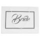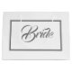 Elegante bolsa de regalo para Novia. Texto de script gris dentro de un borde, fondo blanco.