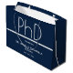 Bolsas de regalo para una fiesta de graduación de doctorado con un diseño azul y blanco. Este artículo es parte de una colección de fiestas de graduación que incluye una invitación, invitación de fotos, servilletas de papel, tarjetas de presentación y más. Personalizar estos artículos, agrégalos a tu carrito y celebra este gran logro. PhD Graduación Azul Partido Gran Bolsa de Regalo Vacacional Diseño | ©Melissa Patton Designer