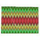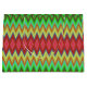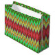 Una bolsa de regalo vibrante con un patrón en zigzag atrevido y colorido en tonos de verde, rojo y amarillo. Tiene asas blancas y transmite un tono festivo y animado.
