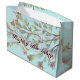 Gran bolsa de regalo de lujo, con diseño de arte floral acuático sobre una elegante luz verde azulada. Diseñar productos de papel para su próximo evento especial. El feliz texto de cumpleaños puede ser personalizado para adaptarse a cualquier celebración especial, incluyendo boda, o un aniversario especial, o evento corporativo. Personalizar estos productos de papel para coordinar tu día especial.