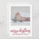 Sencillo granero rojo en tarjeta de Navidad de invierno con nieve. Agregue el nombre de su familia. Estilo campestre.