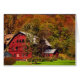 La brillantez de un día soleado del otoño se celebra en esta tarjeta de nota hermosa de la fotografía de la bella arte. Aquí está un granero carmesí en un valle en la parte inferior de una colina que se cubra con colores preciosos del follaje de otoño de rojo, de anaranjado, de amarillo, el oro y el verde. La fotografía se ha aumentado para crear un efecto impresionista, artístico.
