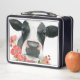 Granja de amapolas I por Grace Popp. Cuenta con un primer plano de una vaca rodeada de vibrantes flores rojas rosadas.