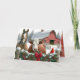 Tarjeta de Navidad personalizada. Bonita ilustración de estilo acuarela de un caballo marrón, vaca manchada en una granja en un día invernal nevado con un cardenal en la cerca rústica y un granero rojo en el fondo.