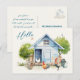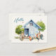 Tarjeta postal con gallinero y mensaje impreso opcional y dirección. El gran texto "hola" en la parte delantera está impreso en la esquina superior izquierda sobre un diseño lindo de gallinero azul. Los árboles verdes de verano asoman detrás de la casa del pollo, con gallinas y gallo en el patio. Perfecto para mantenerse en contacto con amigos, personalice con un mensaje en la parte posterior. También agregue una dirección de correo a la plantilla proporcionada, o elimine el texto de ejemplo para ordenar en blanco.