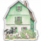 Esta encantadora tarjeta de cumpleaños cuenta con una antigua granja de graneros verdes con ventanas cerradas. Una vaca, un cerdo y un cordero parados frente al granero.
