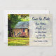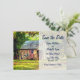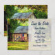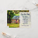 Este anuncio de boda Save the Date presenta un granero rústico con una bandera estadounidense patriótica y la palabra Amor en un encantador entorno campestre arbolado.