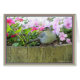 Tarjeta en blanco: Un pájaro gris en barril de flores.