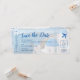 Una boda con destino de pasaje de embarque con destino a un billete de avión salva la tarjeta de cita para un Boda de Santorini, Grecia, con la icónica iglesia de la cúpula azul con vistas al mar Ageo y a los acantilados. Utilice la herramienta de diseño para salir de forma avanzada del diseño, como cambiar el color del texto, el tipo de letra y la posición, el fondo de la tarjeta y el color del avión. Contáctame para coordinar los elementos que estás buscando, o usa el "transferir este diseño" para crear el tuyo en cualquier elemento de Zazzle.