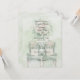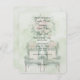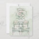 Pink roses peek through the green background. Dark green text in pretty fonts highlight the invitation