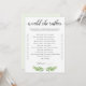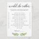 ¿Buscas el rompehielos perfecto para que la gente hable y el humor fiesta de tu ducha de bebé? ¡Jugaría Lo Que Ella Prefiere! Después de todo, sus invitados tienen una cosa en común: ustedes conocen a la futura madre. Esta ducha de bebé con temática de vegetación le gustaría jugar con hojas de color verde agua es perfecta para una ducha de bebé neutra de género. Este divertido juego es muy fácil de jugar. Sólo hay una regla: debes elegir una respuesta. Dé a todos 5-10 minutos para marcar las opciones en la hoja de juego que creen que haría la futura mamá. Cuando todo el mundo haya terminado, pregúntale a la futura madre qué es lo que realmente elegiría y subiría tus puntuaciones. ¡La persona con las respuestas más correctas gana!