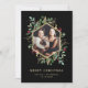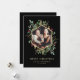 Esta hermosa tarjeta de Navidad presenta la foto personal de tu familia, rodeada de un marco geométrico de oro falso con hojas doradas a juego, vegetación navideña y bayas rojas de acebo sobre un fondo negro moderno. El texto elegante dice "Feliz Navidad", pero puedes cambiarlo a tu propio saludo de fiestas felices.