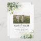 Verdor Guardar la fecha con tarjeta de foto. El Bridal Shower Invitation es elegante y elegante, y cuenta con una preciosa vegetación acuática pintada a mano. Buscar elementos coincidentes en la colección Floral de Greenery Eucalyptus.
