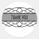 Elegante y elegante Boda Deco Flourish Gracias a los Pegatinas que tienen un elegante borde gris giratorio. Este elegante diseño es la elección perfecta para un boda de estilo vintage inspirado en la moda deco. Fácil de personalizar, simplemente agregue los detalles de su boda en los campos de texto proporcionados. Haga clic en "Personalizar" para encontrar más opciones de personalización.
