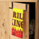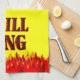 Grill King dijo BBQ divertido en un tipo de letra flameante occidental sobre un fondo amarillo para cocineros y cocineros cocineros. Con arte gráfico de llamas rojas y naranjas en la parte inferior del diseño.