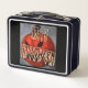 Este dibujo gráfico, editado digitalmente, para realzar, este vibrante, naranja y negro, calabaza, con amenazante inclinación a la sonrisa, hacia la derecha, contra un fondo azul-gris, con Feliz Halloween, Emblazado, al otro lado del frente, en macabro, de color pálido, con letras.