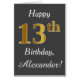 Este sencillo diseño de tarjeta de cumpleaños incluye el mensaje "Feliz 13 cumpleaños", con el "13″ con un falso aspecto dorado. También incluye un nombre personalizado y un fondo gris. Se podría dar a alguien que esté celebrando su decimotercer cumpleaños.
