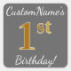 Este sencillo diseño pegatina de cumpleaños incluye un mensaje como "¡Primer cumpleaños de CustomName!", con el "primero" con un aspecto de color falso/imitación de inspiración dorada, en un fondo de color gris (gris). El nombre se puede personalizar. Pegatinas como estos podrían ser tal vez un regalo para alguien que esté celebrando su primer cumpleaños, o tal vez podrían ser usados como decoraciones en una fiesta de cumpleaños. [~Z0000250]