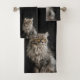 Sentado tranquilamente un gato gris esponjoso y bien crecido. Parece que las rayas de las manteles atraviesan ligeramente la piel.