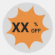 Etiquetas de descuento por día de evento en diseño de burbujas de 1.5" de 9 puntos, una en naranja con texto gris y otra invertida. Marcadores de posición de texto para "XX% desactivado" en negrita en negro. Uso en pantallas de productos, cestas o empaques para soporte visual rápido de promoción. De la colección "Gray Business Card Designs & Marketing Items". Ideal para tiendas, tiendas de regalos, vendedores artesanales o pop-ups locales. Para más ideas de marca, visita www.KBMD3signs.com y para obtener ayuda de personalización, ponte en contacto con nosotros en info@KBMD3signs.com. #EventSaleTag #PromotionalStickers #RetailMarketing