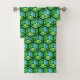 La toalla fijó en un modelo japonés clásico del kimono de grúas estilizadas, dispuesto en un modelo de hexágonos, en verde de jade pálido y medio y azul de cielo de la luz, en un fondo oscuro de verde de jade