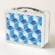 Caja de almuerzo en un clásico patrón de kimono japonés de grúas estilizadas, dispuestas en un patrón de hexágonos, en azul marino / índigo, azul medio y blanco, sobre un fondo azul cielo claro
