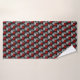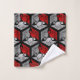 Toalla colocada en un patrón clásico de kimono japonés de grúas estilizadas, dispuestas en un patrón de hexágonos, en rojo profundo, gris claro y medio / gris, sobre un fondo negro