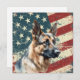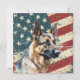 A watercolor portrait of a beautiful German Shepherd Dog is placed against a grunge background of the USA flag. The back of this all occasion flat card has a text field for you to customize.