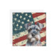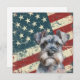 A watercolor portrait of a beautiful Miniature Schnauzer Terrier Dog is placed against a grunge background of the USA flag. The back of this all occasion flat card has a text field for you to customize.
