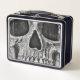 El cráneo gótico negro y blanco cerca. Escándalo, espeluznante, malvado, siniestro, macabro niño vuelve a la caja de almuerzo escolar. Guay, diseño moderno, único, moderno y aterrador de Halloween. Derechos de imagen de Marg Seregelyi Photography.