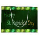 Un ilustracion del Día de San Patricio: 4 formas diferentes de shamrock y letras del "Feliz Día de San Patricio" en los colores de la bandera irlandesa sobre un fondo verde y gris.
