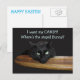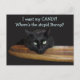 El mensaje en el frente de esta postal dice, "¡Quiero mi dulce ESTÚPIDO! ¿Dónde está el estúpido Conejo?" En la parte de atrás dice, "¡Feliz Pascua!" Esta divertida tarjeta de Pascua presenta a nuestro apuesto gato negro, Ranger, acostado sobre una mesa de madera con la cabeza colgando del borde mirándote. Con los penetrantes ojos verdes de Ranger mirándote, sus orejas ligeramente inclinadas hacia atrás y una mirada de fastidio en su rostro, esta postal es perfecta para todos en Pascua.
