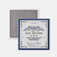 Guarde el imán de fecha para el refrigerador que se muestra. Esta es cuadrada y se muestra en una temática floreciente azul zafiro, gris plateado y negro. Texto preformateado para personalizar con nombres y fecha. Personalizar este elemento y cambia el texto al tuyo. Imagen de stock freepik.com