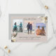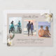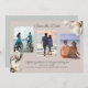 Tarjetas de aviso de fecha con flores de magnolia y tres plantillas de foto. Las flores blancas de magnolia sureña decoran las esquinas de tarjetas planas horizontales de color beige rosado. Las plantillas de foto están escalonadas, con la izquierda un poco más alta que la del centro y la foto de la derecha un poco más baja. Las fotos de cualquier orientación funcionarán si el sujeto está en el centro. "Guarde la fecha" en la parte superior, con nombres completos, fecha y lugar de la boda en la parte inferior. Los colores coinciden con la colección de papelería de magnolia sureña.