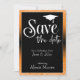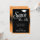 Utilizando dos tipos de letra distintivos, he creado gráficos para su invitación. El encabezado dice "Guardar la fecha" y encima se muestra un gráfico que representa un límite de graduación. Todo el texto se colocó sobre un rectángulo negro bordeado que sobrepone un fondo naranja brillante. El efecto del borde se completa con el contraste de los tonos blancos sobre este fondo de color más intenso, junto con una imagen de gradiente negro que crea un resultado sombrío. ¡Cambia el color de fondo a lo que quieras! El límite de graduación también aparece en la parte posterior. // 130, 131 //