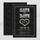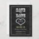 Esta divertida invitación vintage de pizarra para guardar la fecha presenta un borde punteado con las palabras "GUARDAR la FECHA" escritas en un estilo de letra que parece vintage. Un corazón aparece debajo de las palabras "GUARDAR la FECHA" que parece haber sido creado con tiza. Dentro del corazón, puedes personalizar el diseño con tu monograma o iniciales, apareciendo las de ella en rosa y las de él en azul. Debajo del corazón está tu fecha especial en amarillo y los detalles que incluyen tus nombres y dónde te vas a casar, con las palabras "invitación formal a seguir" que aparecen en la parte inferior en amarillo. Una gran invitación vintage de pizarra para guardar la fecha. Copyright henishouseofpaper
