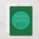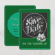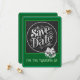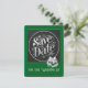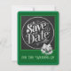 Guardar la fecha tarjeta de boda diseño verde. La parte delantera representa una insignia monocroma con las palabras 'Guardar la fecha'. La parte trasera en verde contiene los detalles personalizados de la próxima boda planificada.