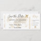 Un moderno y fresco Guardar el guión de fecha mundo de la tarjeta de embarque del avión en un Relieve metalizado de oro falso y blanco simple editable, perfecto para las bodas de destino.