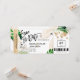 Destino Boda de playa Tarjeta de embarque Ticket Dorado Avión Guardar la fecha con corazón e icono de avión con hojas tropicales