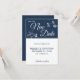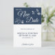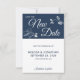 Elegante y romántico floral Salven la nueva tarjeta de postergación del boda de la Nueva Fecha, con un hermoso y delicado diseño de dibujo de la línea de orquídeas blancas en la parte superior, sobre un elegante fondo azul prusiano. La parte inferior se puede personalizar fácilmente editando los campos de plantilla con sus nombres, fecha y ubicación en un tipo de letra azul oscuro, moderno y sencillo, todo-mayúsculas sobre un fondo blanco sencillo. Para mayor personalización o pedidos de personalizados, no dudes en contactarme en acherryonthecake@hotmail.com (por favor, espere entre 1 y 2 días hábiles). Esta tarjeta Save the Date forma parte de la colección "Delicate Orchids - Prussian Blue boda suite" con muchos elementos de coordinación para crear una suite boda única.