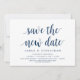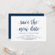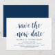 Tarjeta de cambio de fecha. Esta es la invitación de la fiesta de bodas reprogramada (pospuesta / aplazamiento) tarjeta (Guardar nuestra nueva fecha), en el tema de diseño minimalista moderno y limpio, fuente Azul Marino.