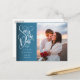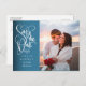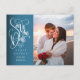 Esta elegante foto de escritura blanca guardar la tarjeta de fecha incluye su foto especial y un guión decorativo guardar la fecha por encima de sus nombres, fecha y lugar. El reverso tiene detalles adicionales para guardar la fecha, incluido el sitio web del boda, con la dirección de devolución y el espacio para la dirección del destinatario. Diseñado por Thisisnotme©