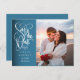 Esta elegante foto de escritura blanca guardar la tarjeta de fecha incluye su foto especial y un guión decorativo guardar la fecha por encima de sus nombres, fecha y lugar. Puede personalizar el color de la reversa para que se ajuste o agregue un mensaje. Diseñado por Thisisnotme©