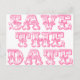 Un precioso tipo de letra vintage en rosa con el mensaje "Save The Date" llenando todo el espacio en la parte delantera de la tarjeta. El diseño, elegante y original, se adaptaría a una temática tradicional y a una temática moderna de estilo peculiar. Hay otros colores disponibles en mi tienda bajo la sección "Slogan" shop.