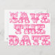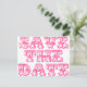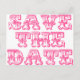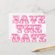 Un precioso tipo de letra vintage en rosa con el mensaje "Save The Date" llenando todo el espacio en la parte delantera de la tarjeta. El diseño, elegante y original, se adaptaría a una temática tradicional y a una temática moderna de estilo peculiar. Otros colores disponibles en mi tienda bajo la sección "Eslogan".
