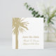 Guarda las tarjetas de boda de la playa de arena fina y palmera. Plantilla de diseño tropical con impresión en dos lados. Ideal para bodas de verano y de destino.