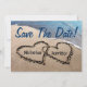 "¡Salven la fecha!" texto en azul, o cambiar fácilmente la redacción, se agrega en esta bella foto original de dos corazones escritos en la arena a lo largo del agua azul del océano para significar amor y romance. Inserte fácilmente el nombre de la novia y del novio en el corazón como se muestra. Los nombres de ejemplo se escriben en el estilo y color de tipo de letra y se pueden cambiar fácilmente. Coloque el texto de su personalizado y los detalles e información en la parte posterior de la invitación o simplemente deje en blanco si lo desea. Gran concepto para los próximos compromisos de verano, bodas, aniversarios, y guardar las invitaciones de fecha y invitaciones para la feliz pareja.